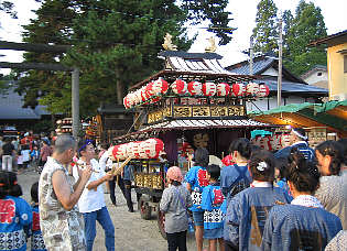 | 2日夜・3日昼・3日夜、太鼓台は 諏方神社境内に集結しますので (午後6時−7時)全ての山車が 見れます。 |